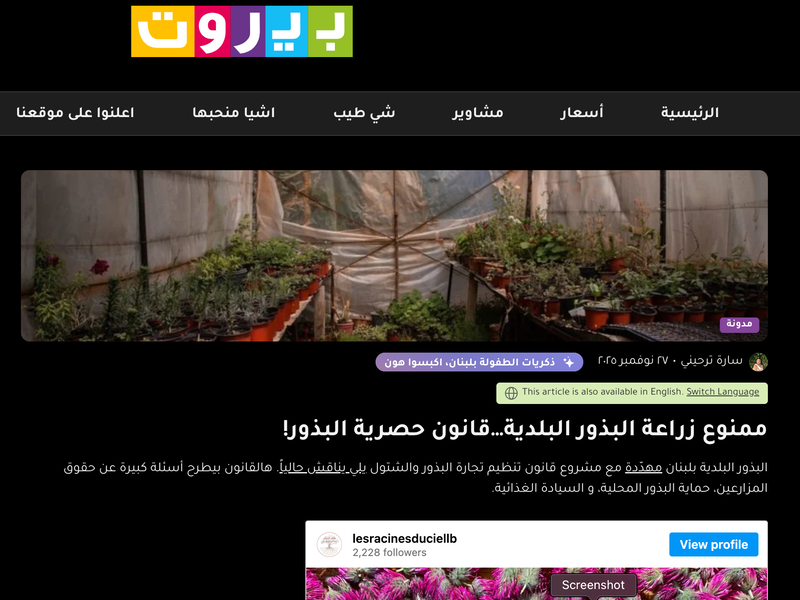 Articles Filters Keywords Types News (44) Statements (6) In The Press (29) Interviews (10) Knowledge Hub (11) Studies (5) Laws (2) Publications (4) Work (10) Causes (2) Programs (6) Food Sovereignty (4) Sort by Relevance Newest first Oldest first A -> Z Z -> A Search Reset Displaying 62 results The "Agricultural Movement" condemned the enemy's spraying of toxic substances in the south 09 February 2026 خطة التنمية الاستراتيجية لتأسيس المجلس الوطني اللبناني للتسميات المحمية 01 November 2002 قانون حصرية البذور تأثير القانون على الزراعة المنزلية. 01 December 2025 قراءة المقال حقوق ملكيّة أم عبودية بذور؟ مخاطر القانون على السيادة الغذائية. 01 December 2025 قراءة المقال كارثة بيئية وأزمات زراعية نبش مشروع قانون قديم وإشكالي. 01 December 2025 قراءة المقال اقتراح قانون «مشبوه» فتح الطريق لـ«الاستعمار الغذائي». 01 December 2025 قراءة المقال نقاش غني حول القانون تعديلات الهيئة الوطنية لحقوق الإنسان. 02 December 2025 قراءة المقال لجنة البذور تطالب بإشراكها المطالبة بحظر البذور المعدلة وراثياً. 03 December 2025 قراءة المقال أوهام الزراعة في لبنان قراءة نقدية في السياسات الزراعية. 03 December 2025 قراءة المقال حماية حقوق المزارعين واتفاقية يوبوف فيديو توضيحي حول مخاطر اتفاقية الـ UPOV. 03 December 2025 مشاهدة الفيديو Agricultural Movement Coverage Watch movement activities on Instagram. 03 December 2025 Watch reel SocioEconomic Action on Seed Law متابعة للحراك الاقتصادي الاجتماعي. 08 December 2025 Seac FB page Pagination First page First Previous page Previous Page 1 Page 2 Page 3 Page 4 Page 5 … Next page Next Last page Last