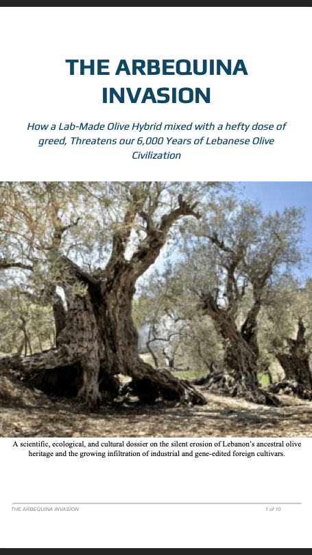 A scientific, ecological, and cultural dossier on the silent erosion of Lebanon’s ancestral olive heritage and the growing infiltration of industrial and gene-edited foreign cultivars.