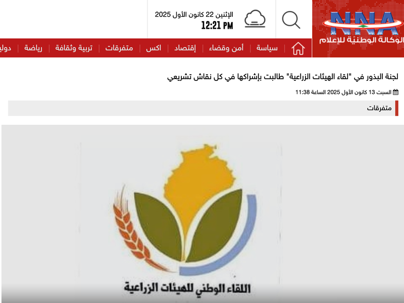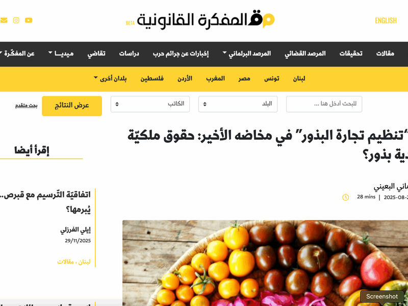 Articles Filters Keywords Types News (44) Statements (6) In The Press (29) Interviews (10) Knowledge Hub (11) Studies (5) Laws (2) Publications (4) Work (10) Causes (2) Programs (6) Food Sovereignty (4) Sort by Relevance Newest first Oldest first A -> Z Z -> A Search Reset Displaying 62 results The "Agricultural Movement" condemned the enemy's spraying of toxic substances in the south 09 February 2026 خطة التنمية الاستراتيجية لتأسيس المجلس الوطني اللبناني للتسميات المحمية 01 November 2002 قانون حصرية البذور تأثير القانون على الزراعة المنزلية. 01 December 2025 قراءة المقال حقوق ملكيّة أم عبودية بذور؟ مخاطر القانون على السيادة الغذائية. 01 December 2025 قراءة المقال كارثة بيئية وأزمات زراعية نبش مشروع قانون قديم وإشكالي. 01 December 2025 قراءة المقال اقتراح قانون «مشبوه» فتح الطريق لـ«الاستعمار الغذائي». 01 December 2025 قراءة المقال نقاش غني حول القانون تعديلات الهيئة الوطنية لحقوق الإنسان. 02 December 2025 قراءة المقال لجنة البذور تطالب بإشراكها المطالبة بحظر البذور المعدلة وراثياً. 03 December 2025 قراءة المقال أوهام الزراعة في لبنان قراءة نقدية في السياسات الزراعية. 03 December 2025 قراءة المقال حماية حقوق المزارعين واتفاقية يوبوف فيديو توضيحي حول مخاطر اتفاقية الـ UPOV. 03 December 2025 مشاهدة الفيديو Agricultural Movement Coverage Watch movement activities on Instagram. 03 December 2025 Watch reel SocioEconomic Action on Seed Law متابعة للحراك الاقتصادي الاجتماعي. 08 December 2025 Seac FB page Pagination First page First Previous page Previous Page 1 Page 2 Page 3 Page 4 Page 5 … Next page Next Last page Last